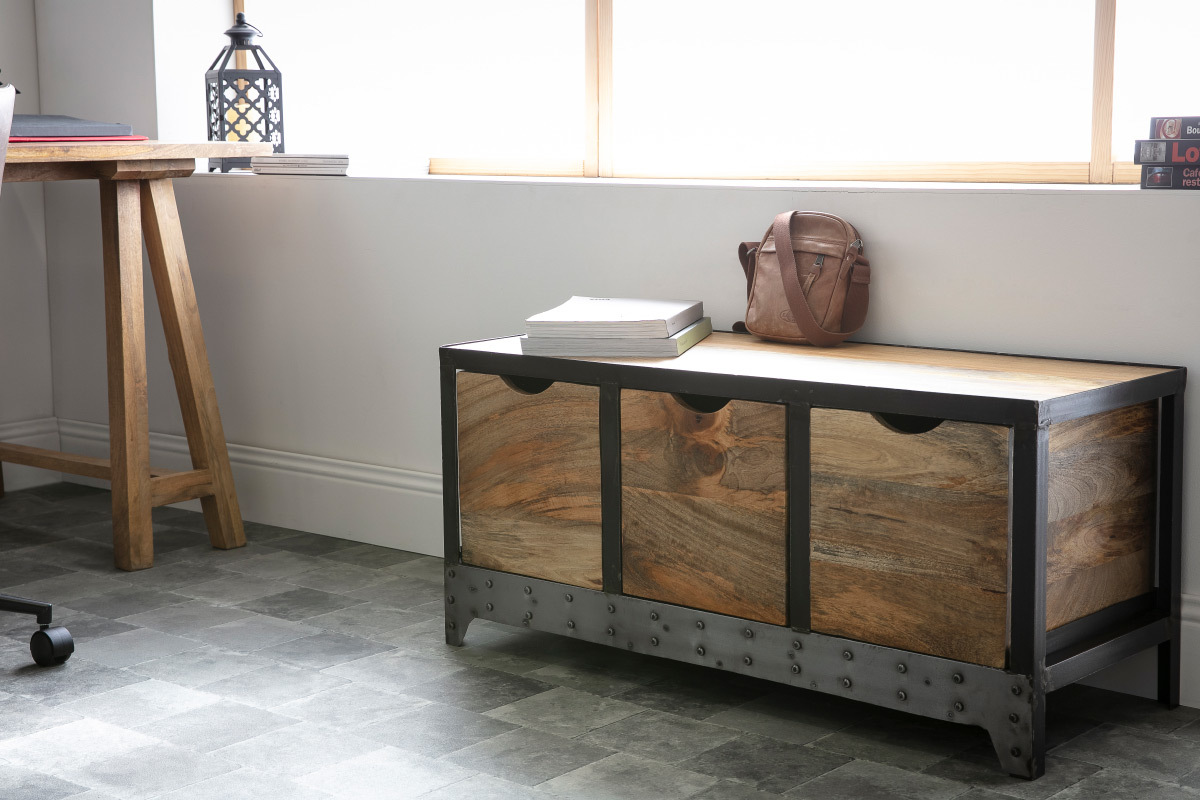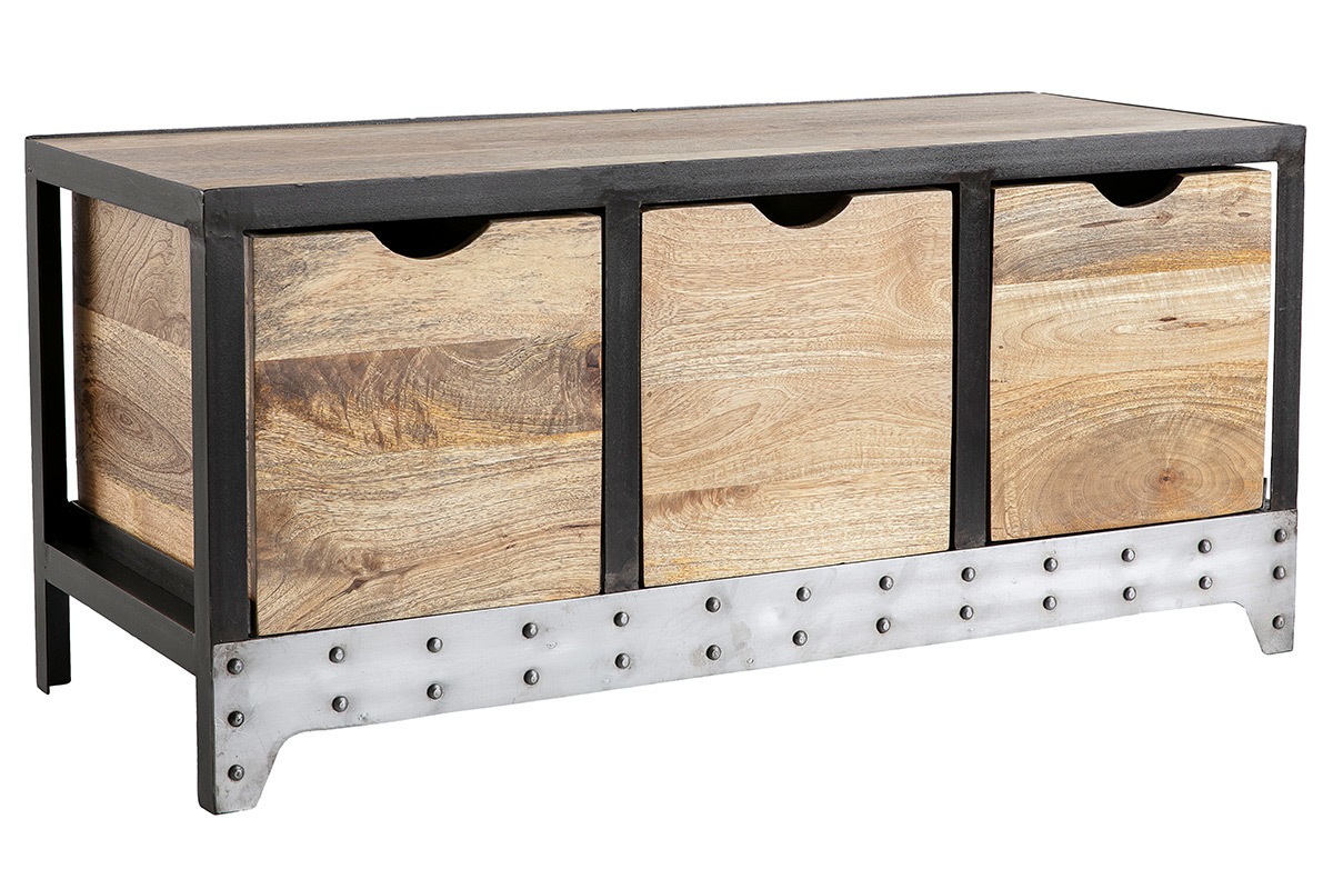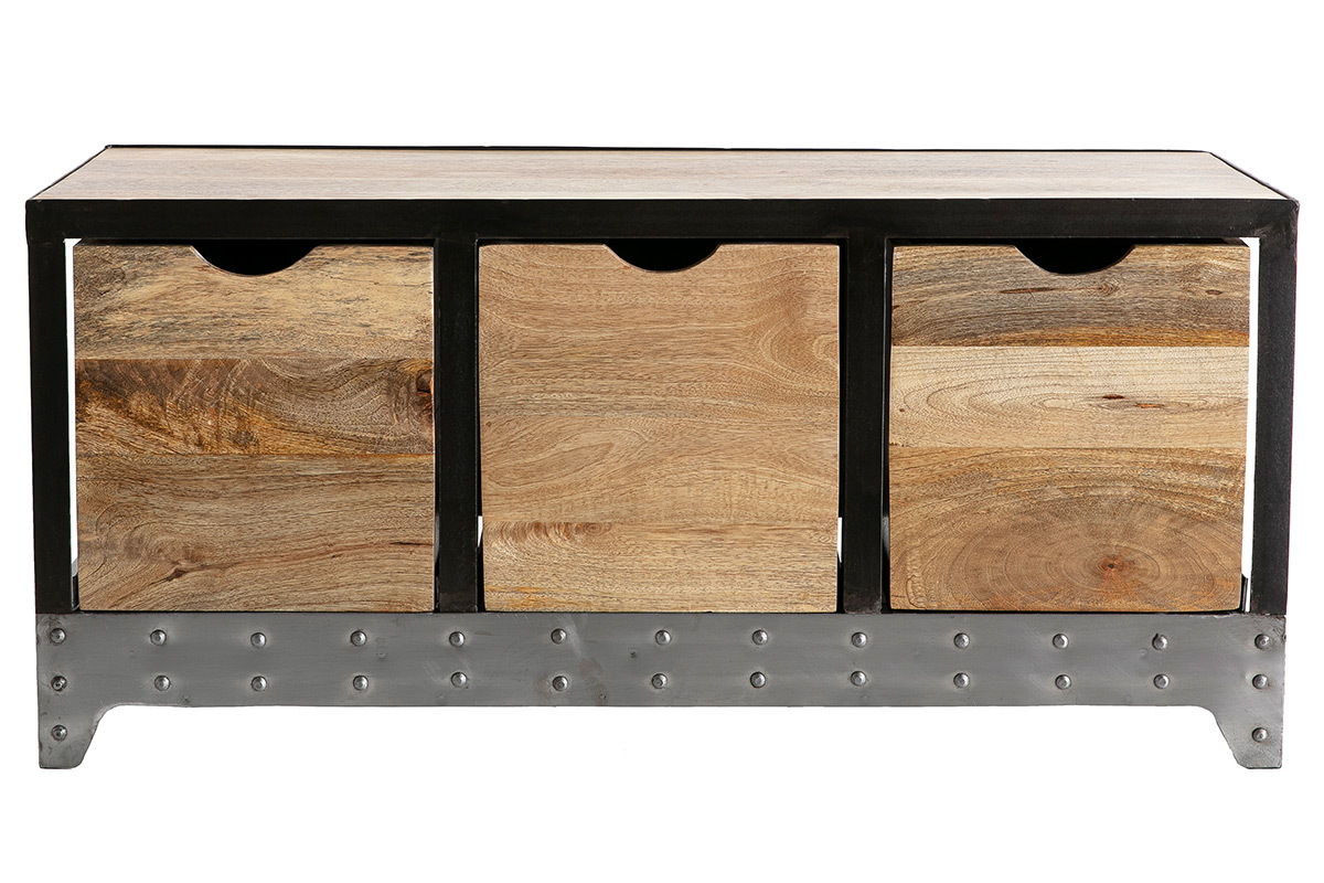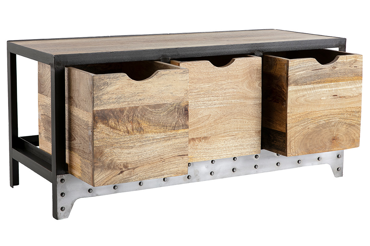 Dla spójnego wystroju odkryj również nasze stoliki kawowe w stylu factory, idealnie pasujące do tej komody.