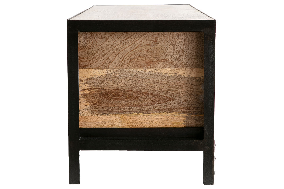 Wygląd vintage komody jest efektem precyzyjnej, ręcznej pracy. Patyna, przetarcia i drobne ślady użytkowe są celowo tworzone poprzez szlifowanie i ręczne wykończenie elementów stalowych. Mango to drewno twarde, trwałe i odporne, niewymagające specjalnej pielęgnacji — znakomicie sprawdza się w meblarstwie wysokiej klasy.