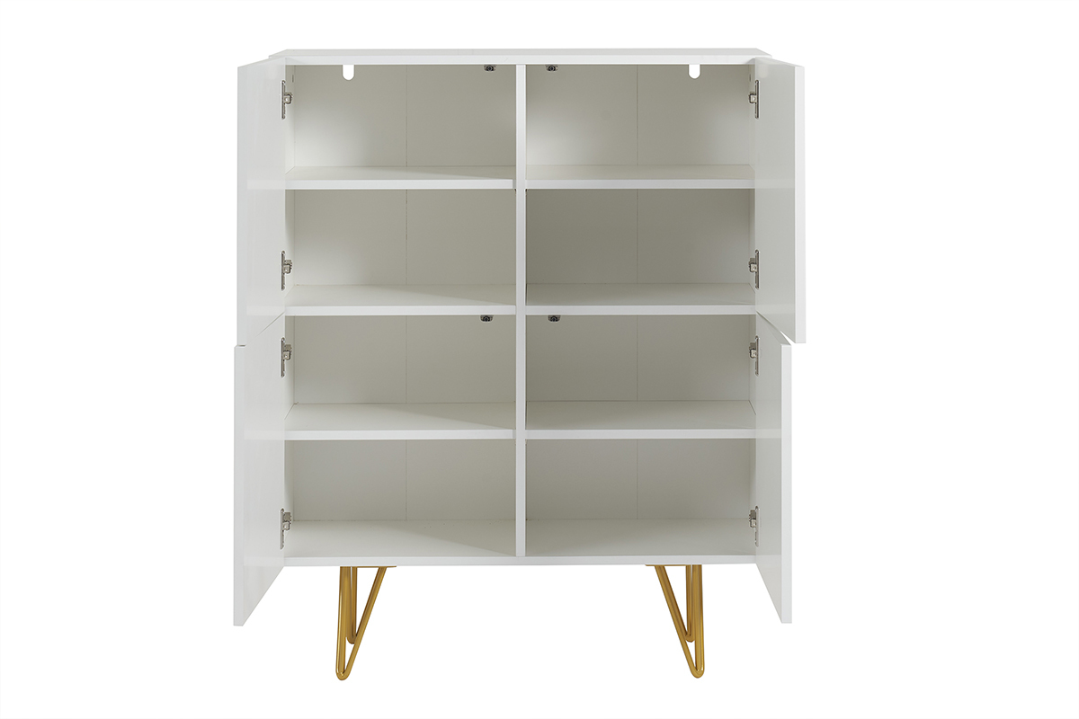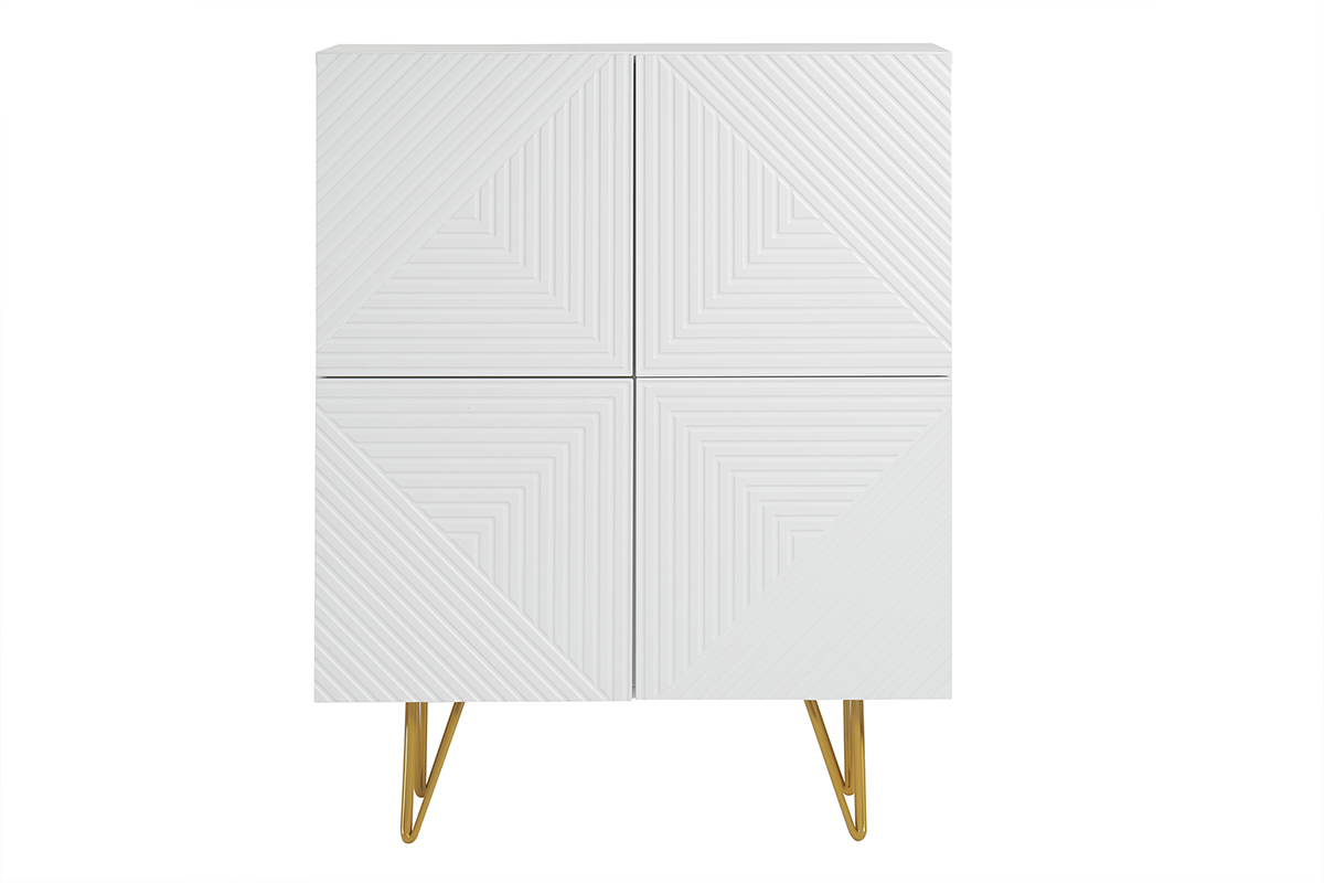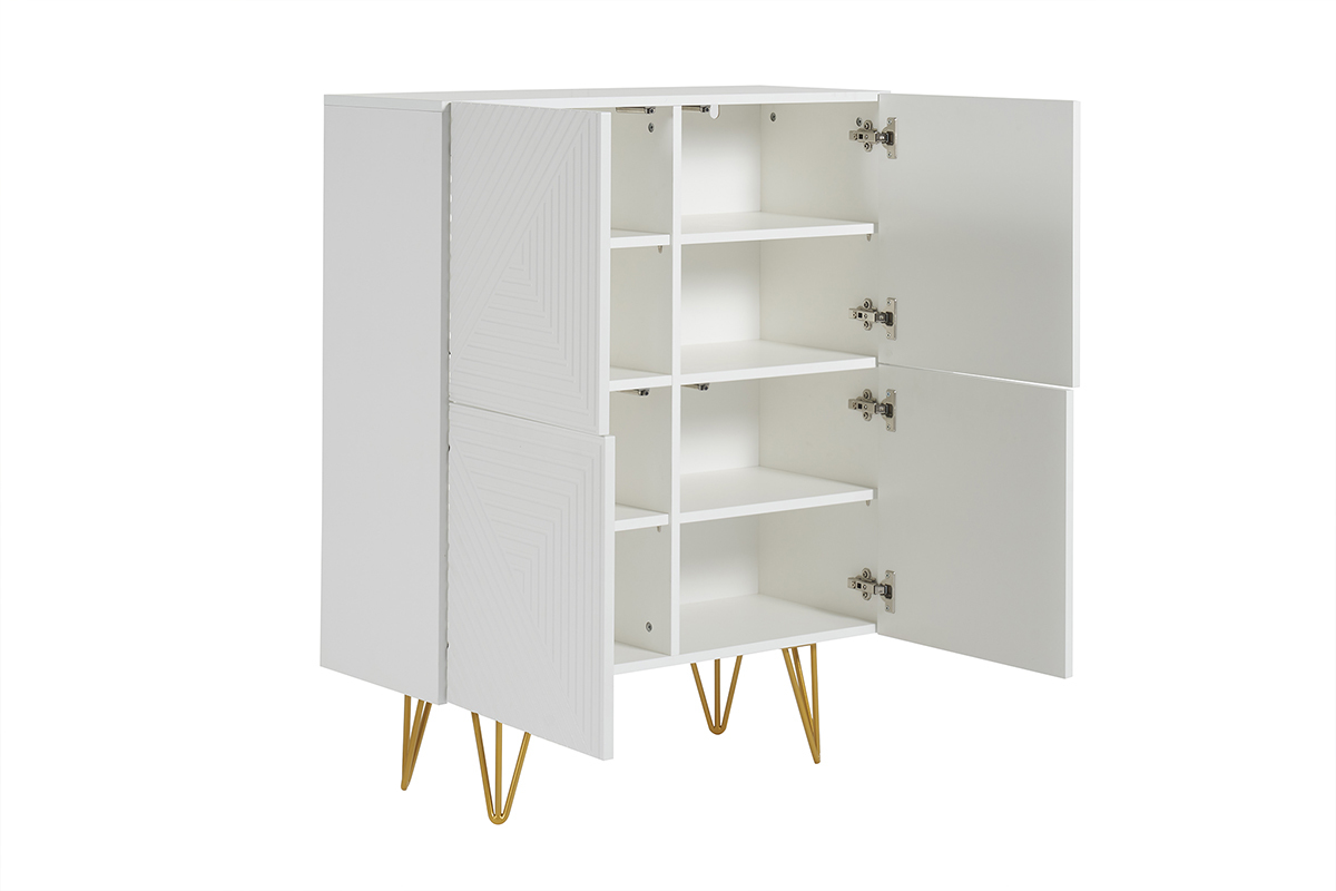 Wysoki kredens OZEN łączy nowoczesną elegancję z wyrafinowaniem dzięki matowemu białemu wykończeniu, frontom z graficznym reliefem oraz złotemu stelażowi typu „epingle”. Lekki, a jednocześnie efektowny, oferuje dużą pojemność dzięki 8 praktycznym wnękom — idealnym na buty, akcesoria lub przedmioty codziennego użytku. Ten biało-złoty mebel, stylowy i funkcjonalny, wnosi do przedpokoju, salonu lub sypialni ponadczasowy glamour i nowoczesny charakter.