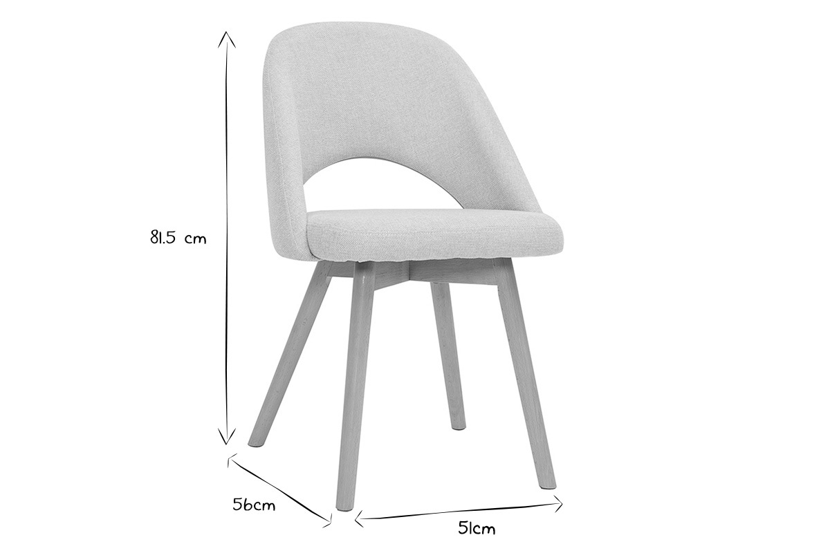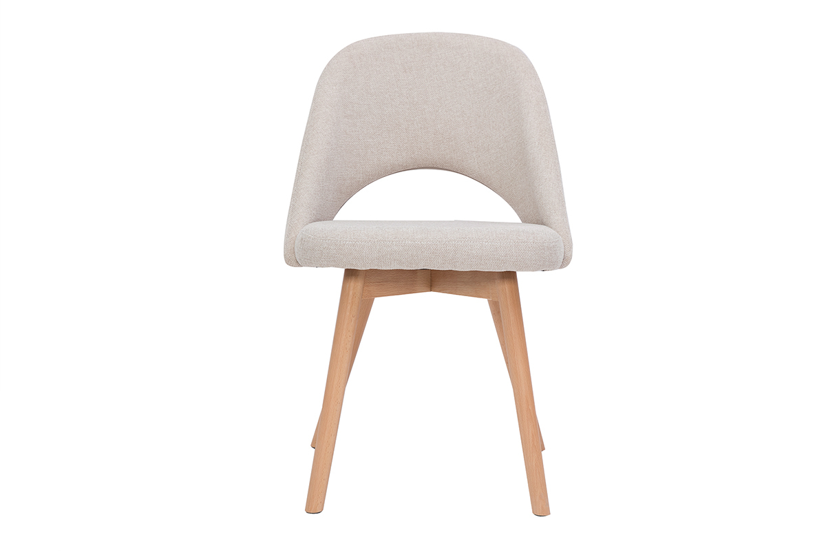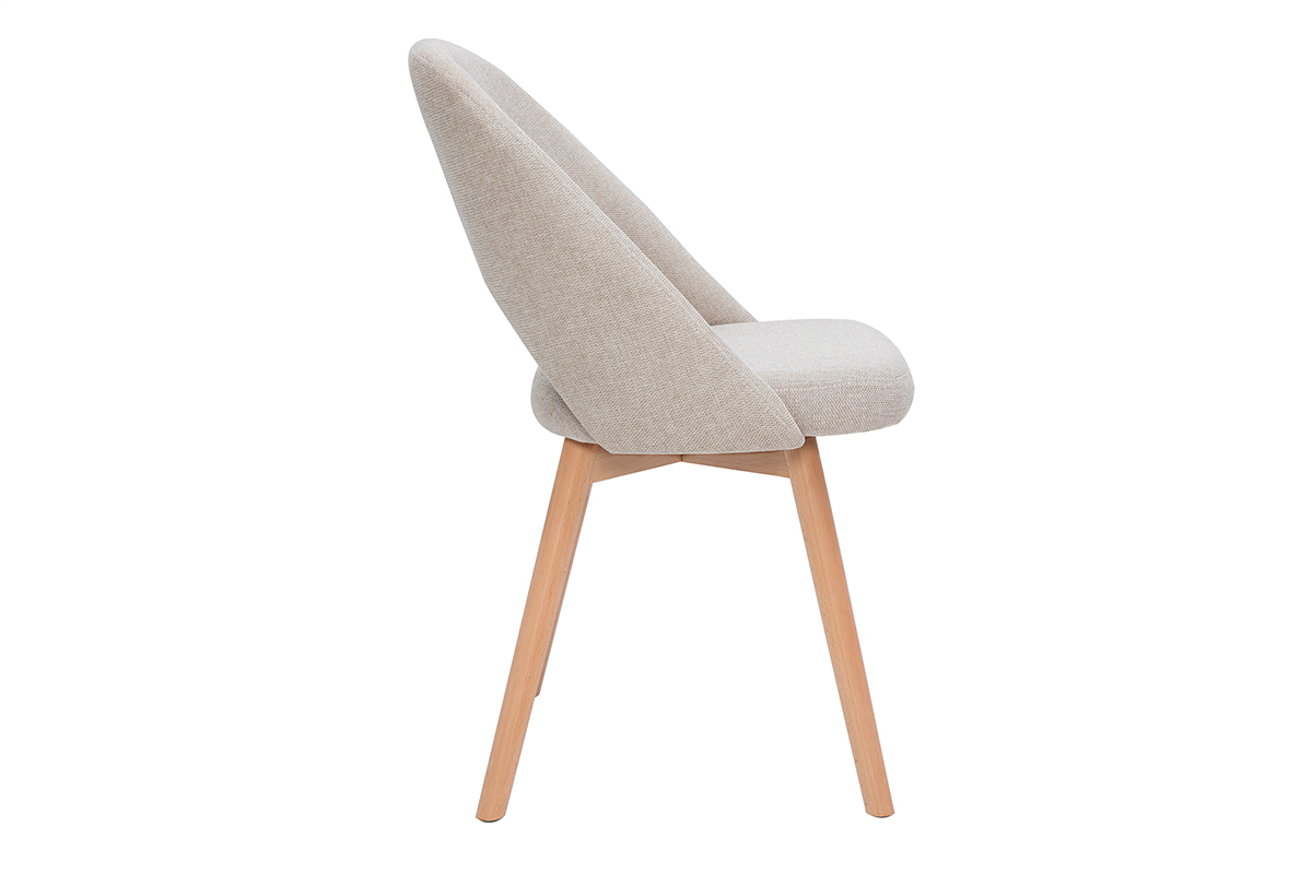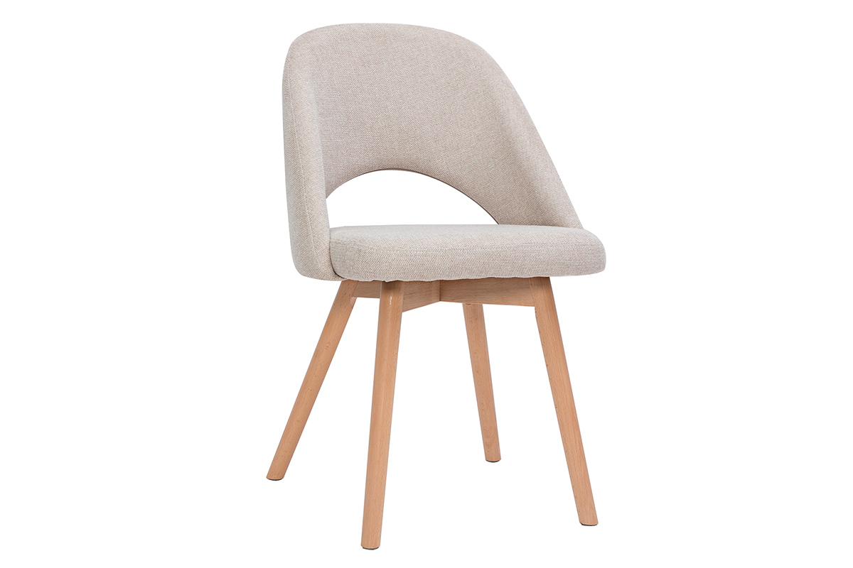 Tapicerka z beżowej tkaniny o fakturze aksamitu (100% poliester) doskonale współgra z nogami wykonanymi z litego drewna bukowego. W zestawieniu ze stołem z jasnego drewna krzesła wprowadzają do jadalni subtelną atmosferę ciepła i harmonii. Lekkie i łatwe do przenoszenia, dzięki otwartemu dołowi oparcia, świetnie odnajdują się w codziennym użytkowaniu.