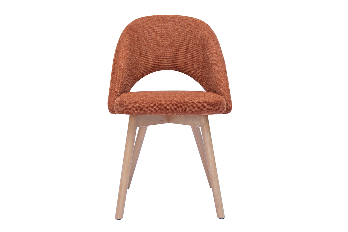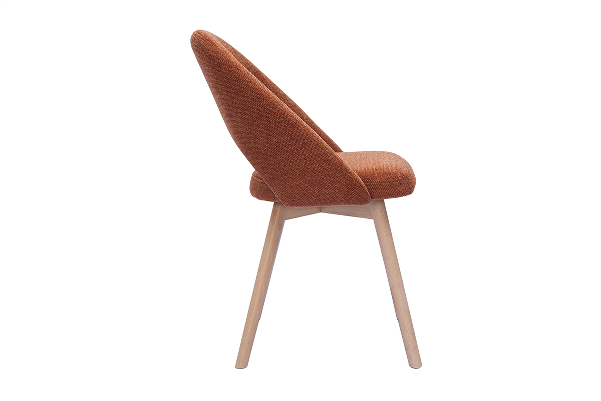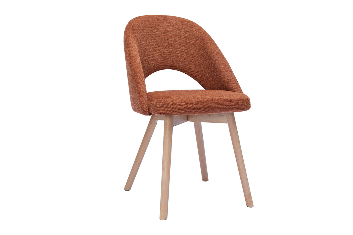 Tkanina o fakturze aksamitu w odcieniu terra bruciata (100% poliester) nadaje krzesłom ciepły i przytulny charakter, idealnie komponując się z nogami z jasnego drewna bukowego. Połączenie materiałów tworzy harmonijną estetykę, idealną do wnętrz skandynawskich, nowoczesnych i naturalnych. Dzięki lekkiej konstrukcji krzesła można z łatwością przestawiać, co czyni je praktycznym rozwiązaniem do codziennego użytku.
