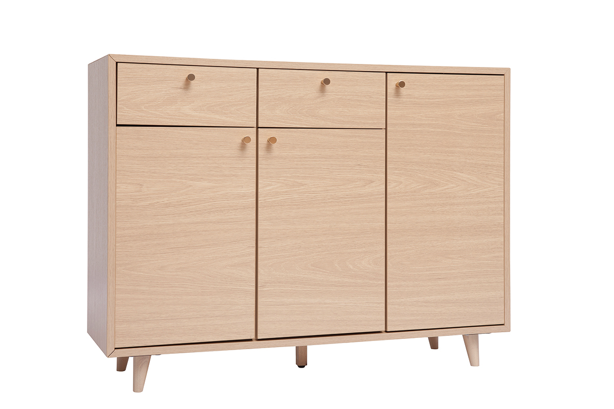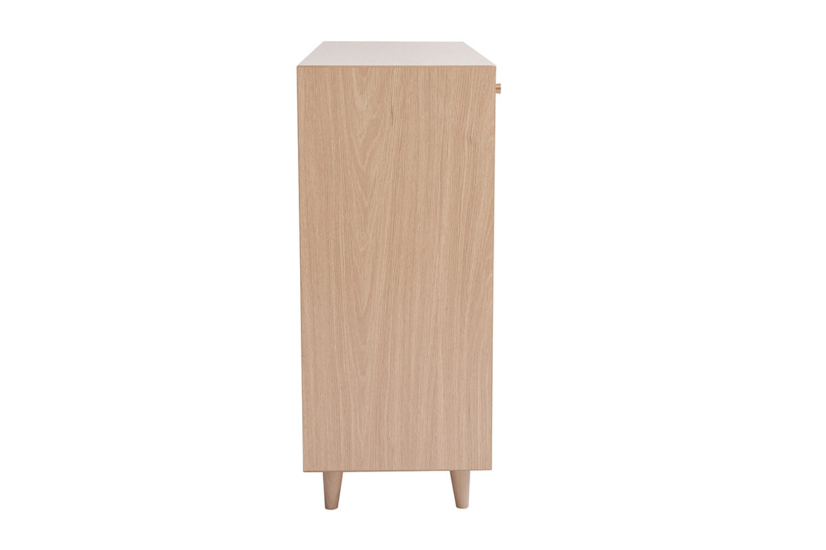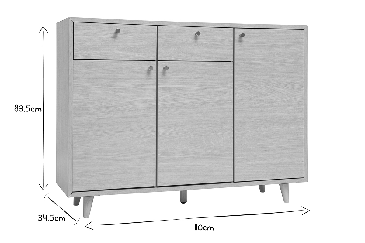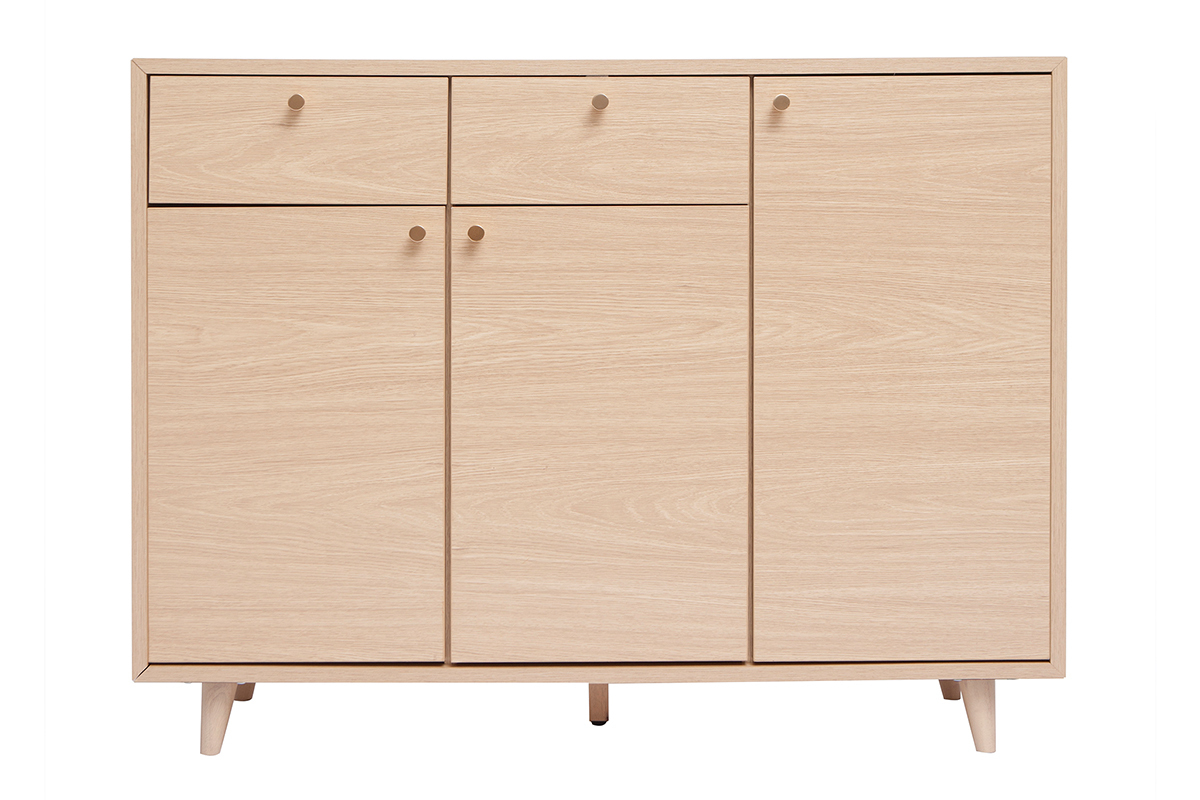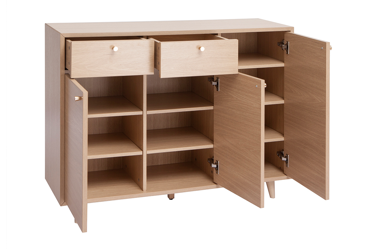 Ten pojemny mebel do przedpokoju oferuje wiele możliwości organizacji przestrzeni: dwa szuflady (L30.5 × P28.5 × H10.4 cm), sześć otwartych nisz centralnych (L34.4 × P31 × H16.5 cm) oraz boczną kolumnę wyposażoną w cztery dodatkowe przegródki (L34.5 × P31 × H16.5 cm). Dzięki temu mebel świetnie sprawdzi się do przechowywania butów, dokumentów, akcesoriów, drobnej elektroniki czy kluczy. Konstrukcja z płyty meblowej wykończonej melaminą w kolorze jasnego dębu, wsparta nogami z litego drewna dębowego, zapewnia wyjątkową trwałość i stabilność.