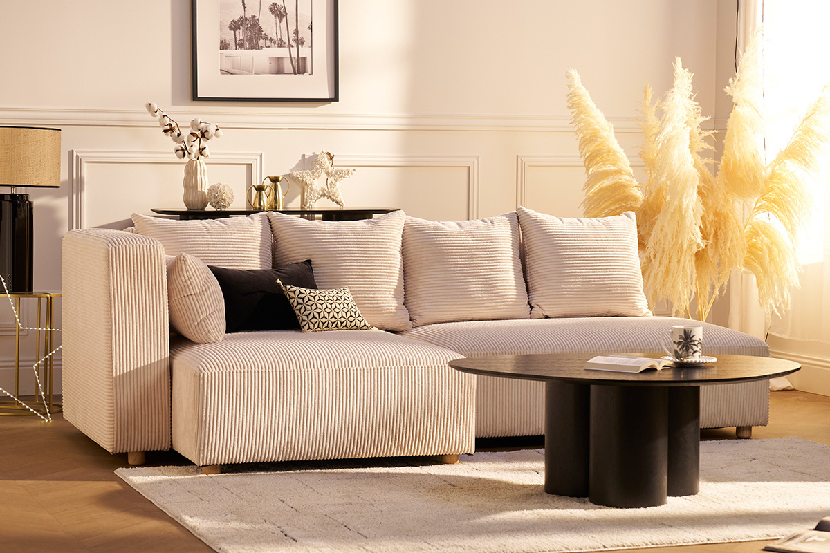 Narożnik HARLEM to prawdziwa oaza komfortu, zaprojektowana, by stać się centralnym punktem Twojego salonu. Jego szerokie siedzisko, miękkie poduchy oraz przyjemny w dotyku welur sztruksowy tworzą idealną przestrzeń do relaksu. Połączenie zaokrąglonych, obszernych form i eleganckiej tkaniny nadaje całości stylu, w którym współczesny design łączy się z klimatem przytulnego wnętrza.