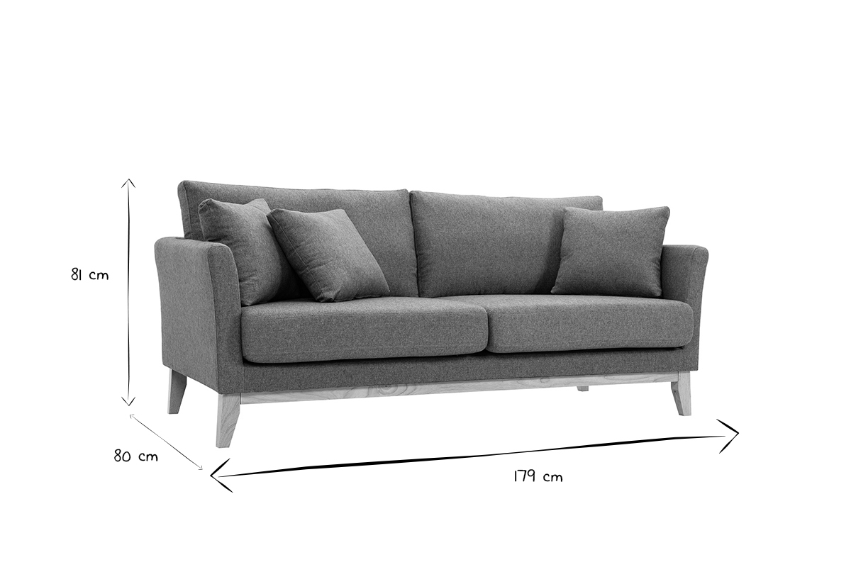 Przy wymiarach L179 × P80 × H81 cm sofa OSLO to kompaktowy mebel, który nie zagraca przestrzeni, a jednocześnie staje się jej centralnym punktem. Jej galbione, miękkie kształty oraz poduszki siedziska i oparcia wypełnione komfortową pianką zapewniają relaks na najwyższym poziomie. Dla jeszcze większej wygody dołączono trzy dodatkowe poduszki dekoracyjne.